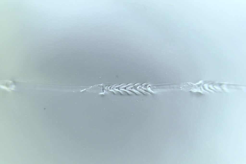 Besonders bei der Rekonstruktion der Bewegungsrichtung von Fahrzeugen oder Anstoßpartnern können Kratzspuren wertvolle Hinweise liefern. Ein von uns durchgeführter Modellversuch, bei dem mit einem stumpfen Gegenstand über ein foliertes Blechteil gekratzt wurde, zeigt die charakteristischen Eigenschaften solcher Beschädigungen. Die dabei entstandenen Spuren verdeutlichen, dass sich anhand der Materialverschiebungen der Folie Rückschlüsse auf die Bewegungsrichtung ziehen lassen.
